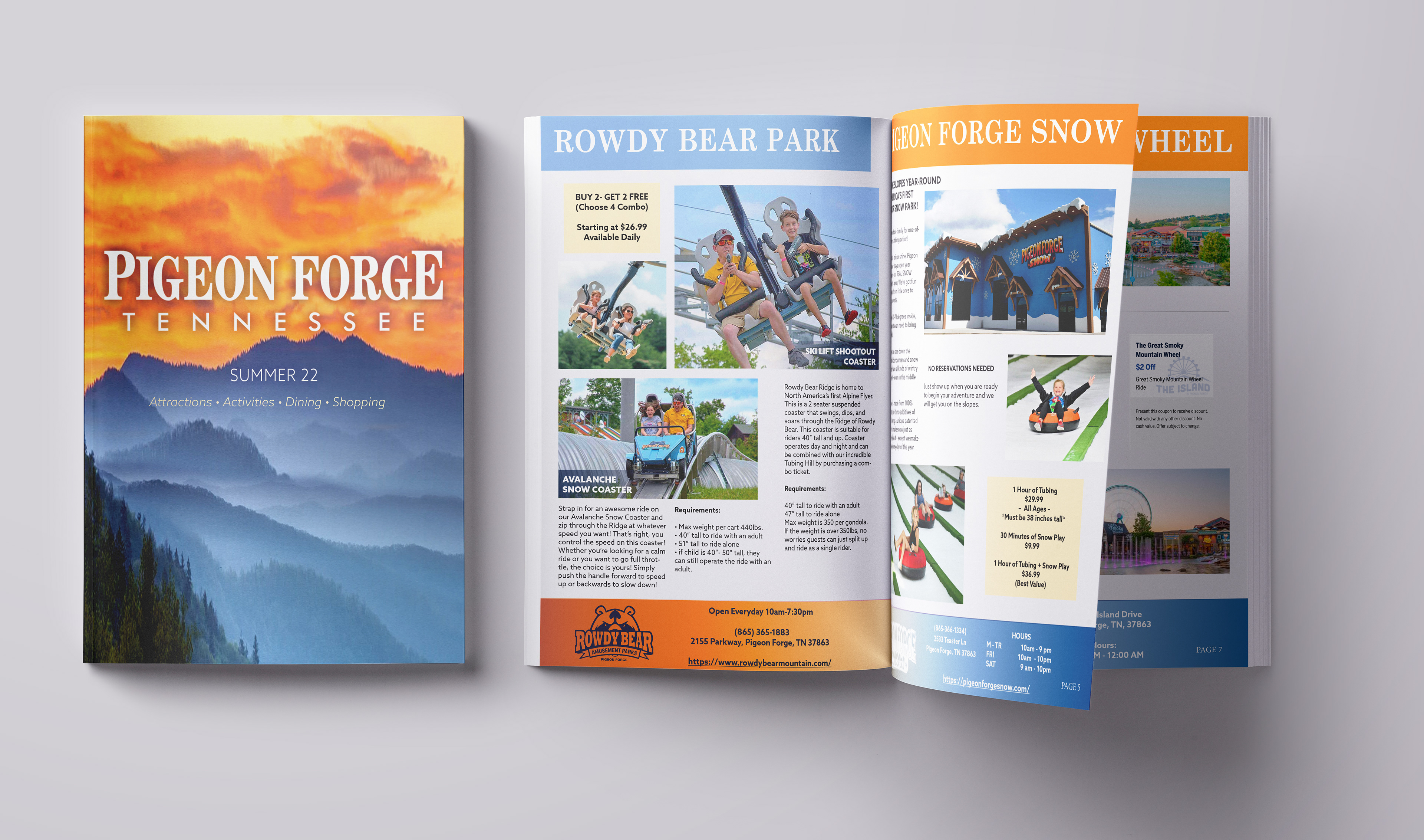 Also, Blank Graphix was tasked with researching, highlighting, and displaying information about family-friendly attractions and restaurants available in the city of Pigeon Forge located in the Smoky Mountains of Tennessee.